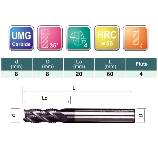 ดอกกัดทำจากคาร์ไบด์ สำหรับกัดงานหยาบ 4 ฟัน ขนาดเส้นผ่านศูนย์กลางของดอก 8 มม ใช้สำหรับงานเหล็ก