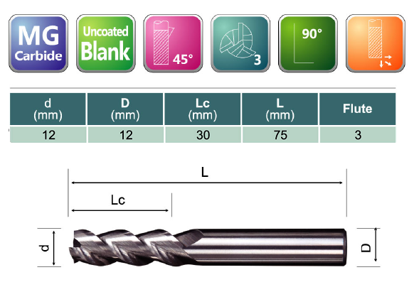 ดอกกัดทำจากคาร์ไบด์ 3 ฟัน ขนาดเส้นผ่านศูนย์กลางของดอก 12 มม ใช้สำหรับกัดงานอลูมิเนียมโดยเฉพาะ